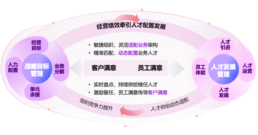“业人融合” 的本质,是将企业经营战略拆解为人才需求,再通过人才能力提升反哺业务增长,形成 “战略 - 人才 - 业务” 的闭环。具体而言,一方面从经营侧出发,通过战略解码明确各业务单元的人才标准和效能目标;另一方面从人才侧出发,搭建动态人才供应链,评估人才能力、绩效与潜力,确保人才供给与业务需求匹配。这一逻辑下,HR 部门不再是业务的 “辅助者”,而是战略的 “共建者”。