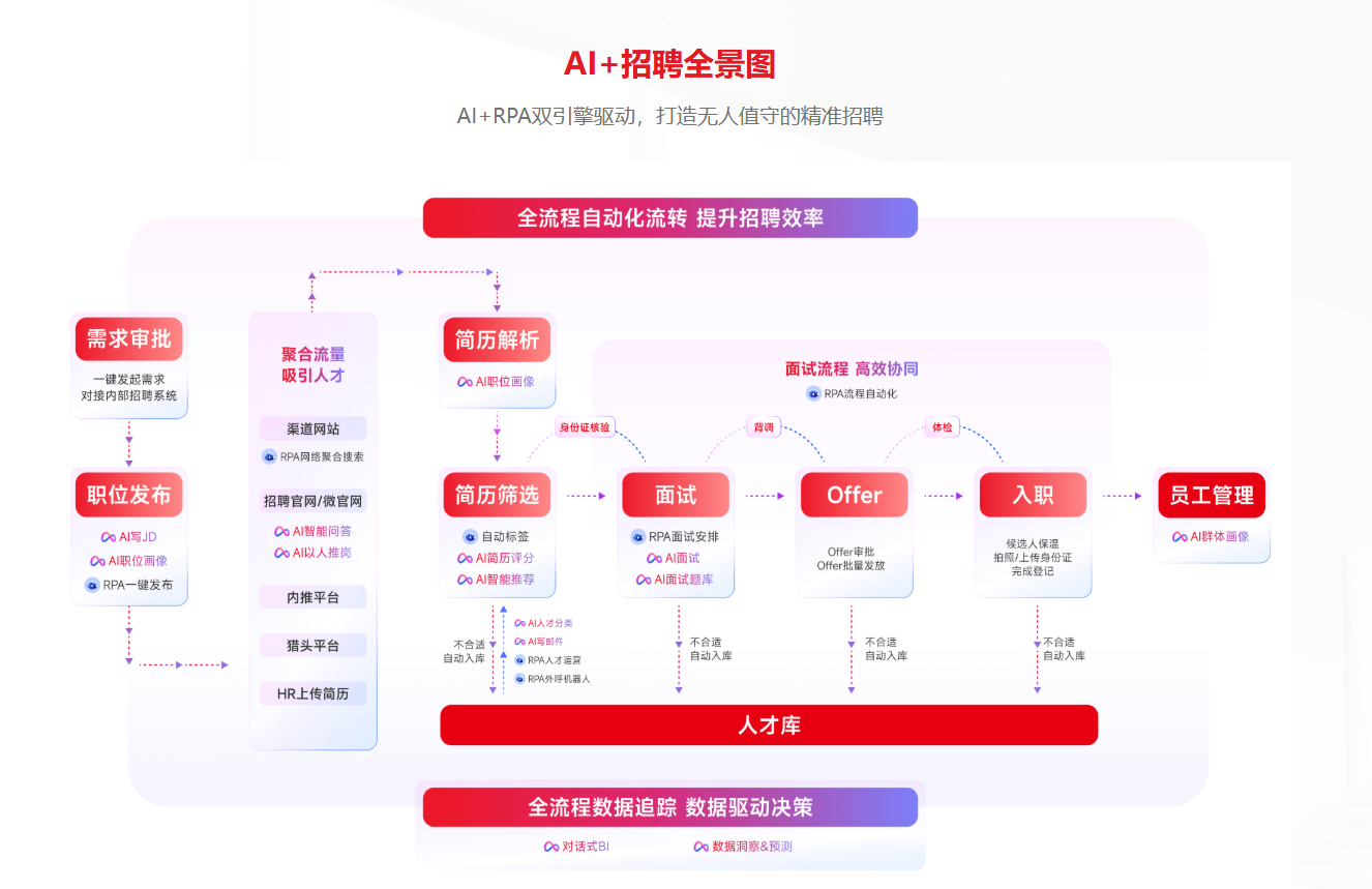 用友打造的 “三大画像” AI 招聘体系,已成为中大型企业的标配。职位画像结合历史高绩效员工数据明确岗位需求;人才画像通过 AI 抽取技能、评估胜任力、完成多模态面试,生成全息人才档案;群体画像分析过往录用员工绩效特征,反哺招聘标准优化。