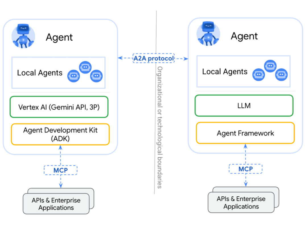 之前我们提的多agent和agentic workflo中的agent们的通讯,就如果我们在一个小团队里面紧密协同那样。而Google提出的A2A协议,把Agent之间的协同范围一下子提升到了全球的范围,它为每个Agent派发了身份证(AgentCard),在经过认识、握手后(鉴权),Agent们可以进行沟通和协作。