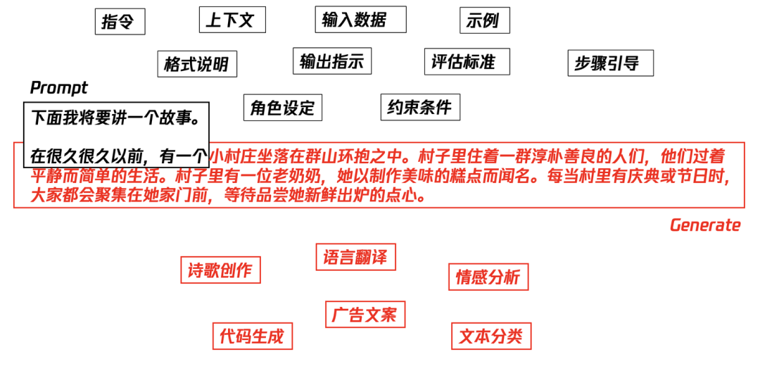 整个核心形态看似简单,一次输入输出。实际上提示词与生成内容两端分别是两个巨大的领域:提示词工程与模型预训练。