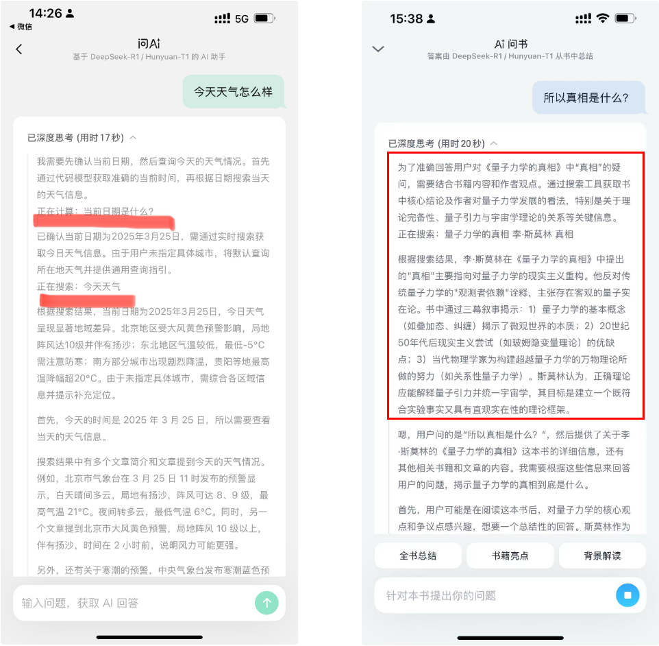 还有微信读书的AI问书、微信输入法的问AI,底层的架构是基于小size的QWen模型做了SFT的Agent + Deepseek R1做最终解读,而在交互层,也是把Agent的工作过程和R1的思考融合呈现到深度思考的内容里了: