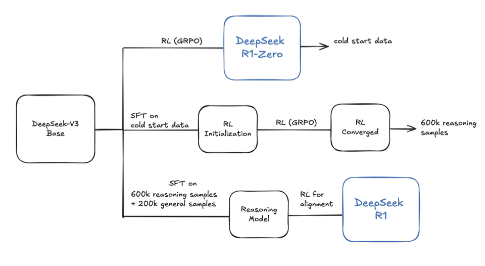 ○ 基于上一个Checkpoint模型生成60万条思维链内容再加上20万条生成的的示例数据进行监督微调,最后通过强化学习进行对齐得到R1。