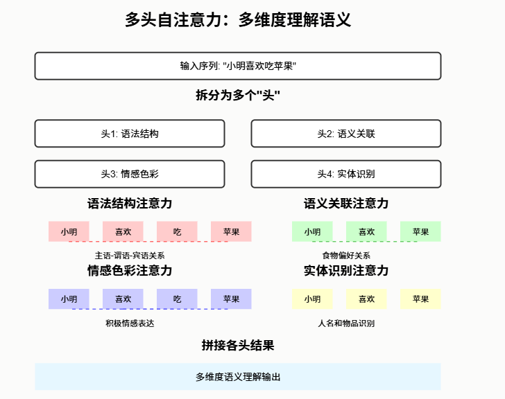 人类分析问题会从不同角度切入,Transformer的"多头注意力"机制模拟了这一过程:将输入文本投影到多个"子空间",每个"头"关注不同特征——有的分析语法结构,有的提取语义关系,有的识别逻辑链条,就像一个专家团队协作,最终形成全面理解