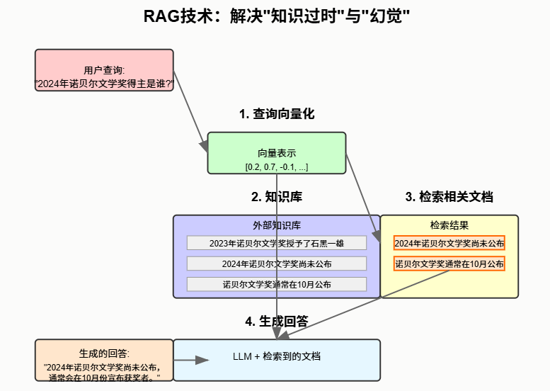 大语言模型有时会"一本正经地胡说八道"(幻觉问题),RAG(检索增强生成) 技术就是解决方案: