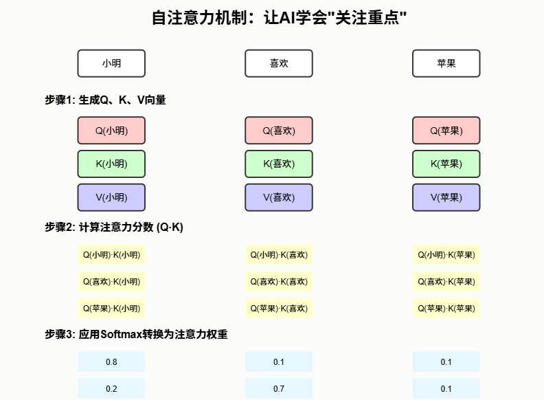 传统AI处理文本像"逐字阅读",容易忽略长距离关联,而自注意力机制(Self-Attention Mechanism)让AI像人类一样"划重点":处理每个词时,动态计算它与上下文其他词的关联度。例如在"我喜欢吃苹果"中,模型会重点关联"吃"与"苹果",准确判断为水果;而在"苹果发布会"中,则关联"发布会"与"苹果",判断为品牌