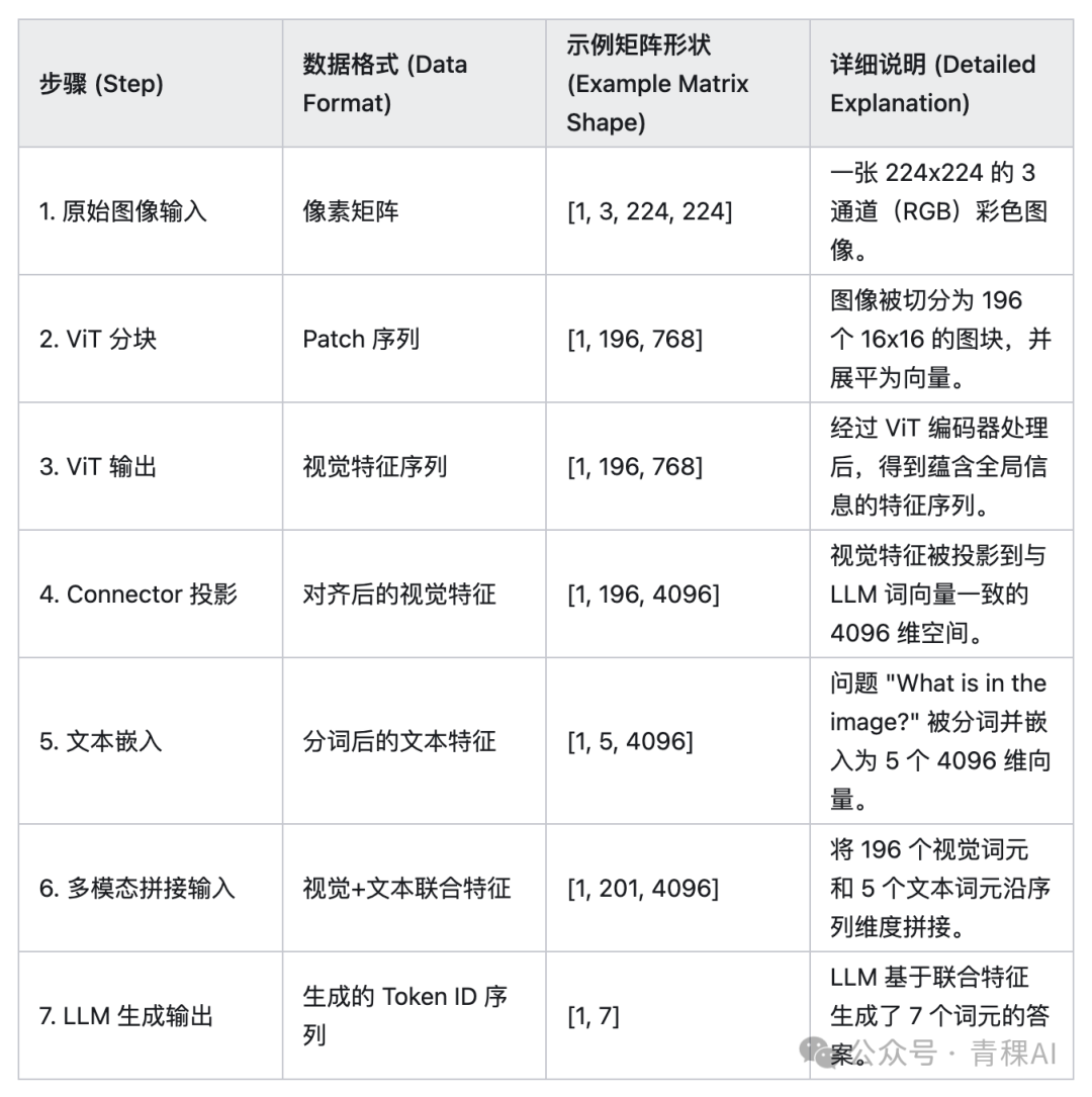 如上图表格的第 3 步和第 4 步所示,连接器接收了 ViT 输出的 [1, 196, 768]维特征,并将其转换为了 [1, 196, 4096] 维的“对齐后视觉特征”。这不仅仅是维度的改变,更是一次深刻的语义空间映射。