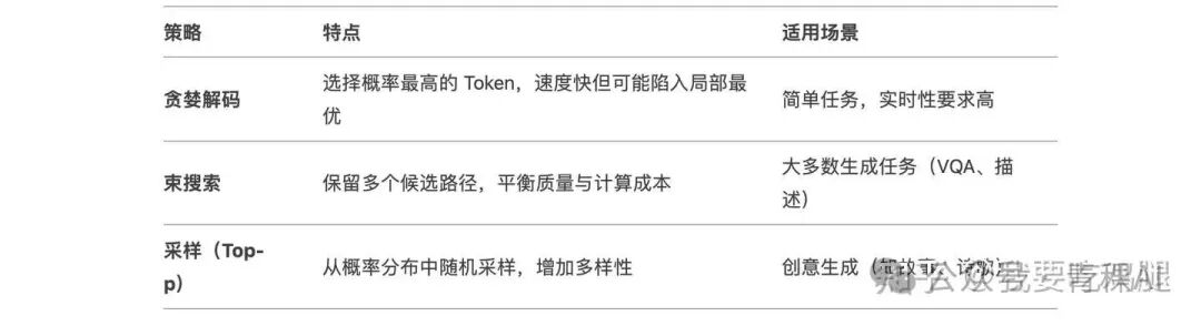- 采样 (Top-p): 与前两种确定性策略不同,采样策略引入了随机性。它不会总是选择概率最高的词,而是根据概率分布进行随机抽样,通常会限定在一个较小的、高质量的候选词集合内(例如 Top-p 采样)。这极大地增加了生成文本的多样性和创造性,使其非常适合需要“灵感迸发”的场景,如根据图片写故事、创作诗歌等。
