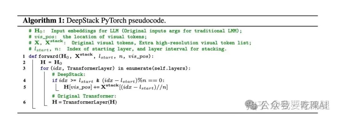 其伪代码显示,核心逻辑仅仅是在 Transformer 层的循环中,增加一个简单的条件判断和一次原地加法 (in-place addition)。具体来说,就是找到当前层隐藏状态中属于视觉词元的部分,然后直接将待注入的额外视觉特征加到它们上面。这与 Qwen3-VL 源码中 _deepstack_process 函数的实现逻辑完全一致,计算开销极小。