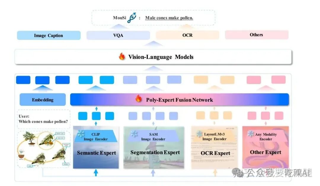 为了更好地理解 DeepStack 的独特性,我们可以将其与 MouSi 模型所代表的“多专家广度融合”路线进行对比。MouSi 采用多个并行的、专门的视觉编码器(如 CLIP, SAM)作为“专家”,分别提取不同维度的信息,然后通过一个复杂的“多专家融合网络”进行整合。如果说 MouSi 是在“广度”上做文章,那么 DeepStack 就是在“深度”上求突破,两条路线各有千秋。