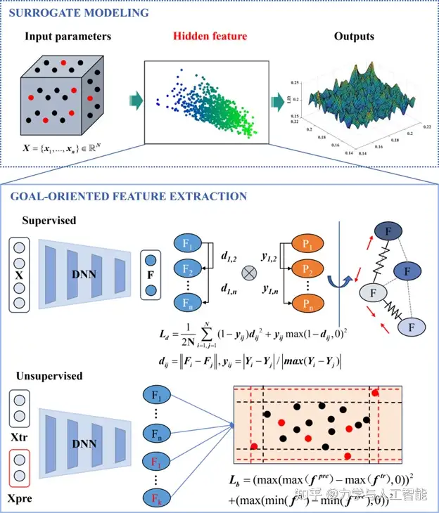 特征的差异将对建模的精度和效率造成显著影响,因此需要分析何种特征是对建模有利的,并以此为目标进行特征提取模型的优化。特别是对于非线性降维方法和代理模型,选择合适的低维特征非常困难,使得不同类型的代理模型对降维方法有不同的偏好。该问题导致降维方法与代理模型之间缺乏必要的相关性标准。从建模的角度来看,为了使基于特征的建模优于直接建模,降维方法引起的预测误差必须低于代理模型的误差容忍度。相反,如果我们从提高模型误差容忍度的角度寻找合适的低维特征,就可以提高建模精度。我们的目标是提出一种通用的特征学习方法,能够显著降低特征空间的维度并增强各种代理模型的泛化能力。