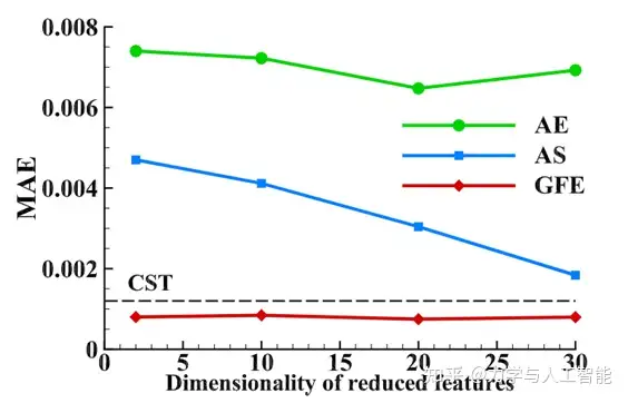 此外,我们还考虑了提取特征维度的影响。自编码器(AE)是一种典型的无监督降维方法。提取的特征与输出结果之间没有明显的联系,因此其准确性与特征维度无关。自适应采样(AS)和全局特征提取(GFE)是两种以目标为导向的方法。然而,AS方法倾向于降低维度,导致精度损失,而GFE则专注于提高建模精度。如图9所示,基于AS方法的建模精度随着维度的增加而增加,这是线性模型的一个典型特性。然而,AS方法的整体准确率低于CST参数化方法。这是因为AS会截断原始特征,从而导致整体精度的下降。在GFE的特征空间中,欧式距离表征了特征差异,使得特征维度变得不那么重要。研究结果显示,与AS方法不同,GFE对维度的变化不敏感。这些建模结果的比较充分展示了以目标为导向方法的独特性。从代理模型的准确性出发,GFE方法可以实现显著的精度提升。