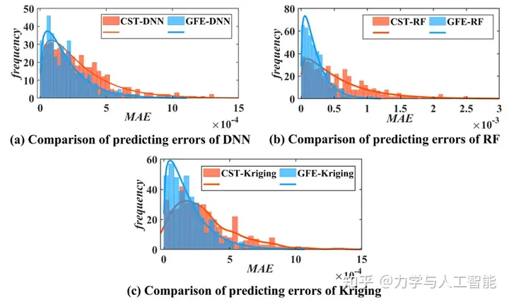 我们分析了400个机翼的气动力预测结果,并比较了三种代理模型的建模精度。如图12和图13所示,横轴代表模型预测的平均绝对误差,纵轴代表误差区间内的统计结果。与原始的36维CST参数相比,通过GFE提取的二维特征构建的代理模型更为精确。通过比较,在提出的GFE方法下,最大预测误差显著降低,且误差区间更为集中。