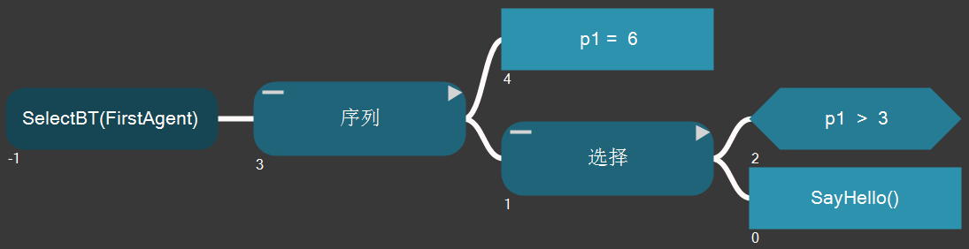 在上面行为树“SequenceBT”中,可以看到序列节点有3个子节点,分别是赋值、条件和动作节点。在依次执行该序列节点的子节点时,赋值节点(p1 = 6)永远返回成功,将继续执行条件节点(p1 > 3),该条件节点也返回成功,因此继续执行动作节点(SayHello),最后期望输出“Hello Behaviac!”。