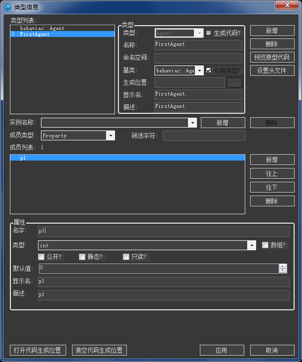 注意:本教程延用了《教程一》的FirstAgent子类及其成员方法SayHello等类型信息,可以参考《教程一》的做法,打开类型信息浏览器创建该子类。此外,还为FirstAgent子类添加了int类型的成员属性p1,如下图所示: