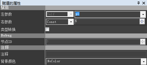 选中上图中的赋值节点,将“左参数”选择为前面所添加的成员属性“p1”,“右参数”直接设置为6,表示程序端在执行该行为树时,会将右值6赋给左值p1,如下图所示: