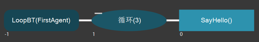 新建行为树“LoopBT”,将根节点的Agent类型设置为“FirstAgent”,并为其添加循环和动作节点,如下图所示: