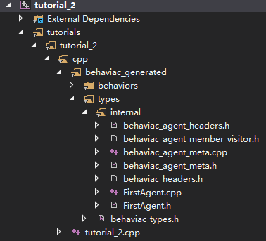 在代码生成目录tutorials/tutorial_2/cpp/behaviac_generated/behaviors下,导出了行为树的C++源码文件,如下图所示: