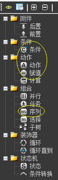 新建行为树“SequenceBT”,将根节点的Agent类型设置为“FirstAgent”,并为其依次添加序列、赋值、条件和动作节点,如下图所示:
