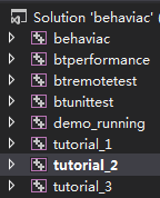 所有C++版教程的项目都包含在源码包中projects/vs2013目录中的工程behaviac.sln,打开该工程文件后,可以看到里面有behaviac组件的源码和所有的教程项目,如下图所示: