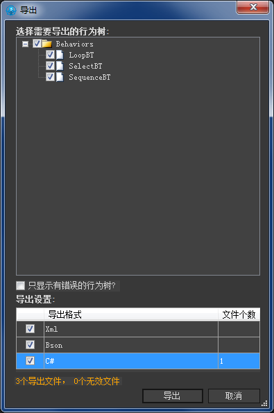 除了支持《教程一》介绍的XML导出格式,behaviac组件还支持BSON、C++和C#格式的行为树导出。