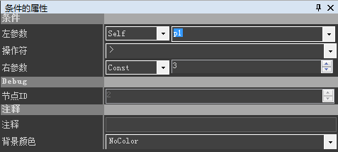 选中上面行为树“SequenceBT”中的条件节点,将“左参数”选择为前面所添加的成员属性“p1”,“右参数”直接设置为3,“操作符”设置为“>”,表示判断p1是否大于3,如下图所示: