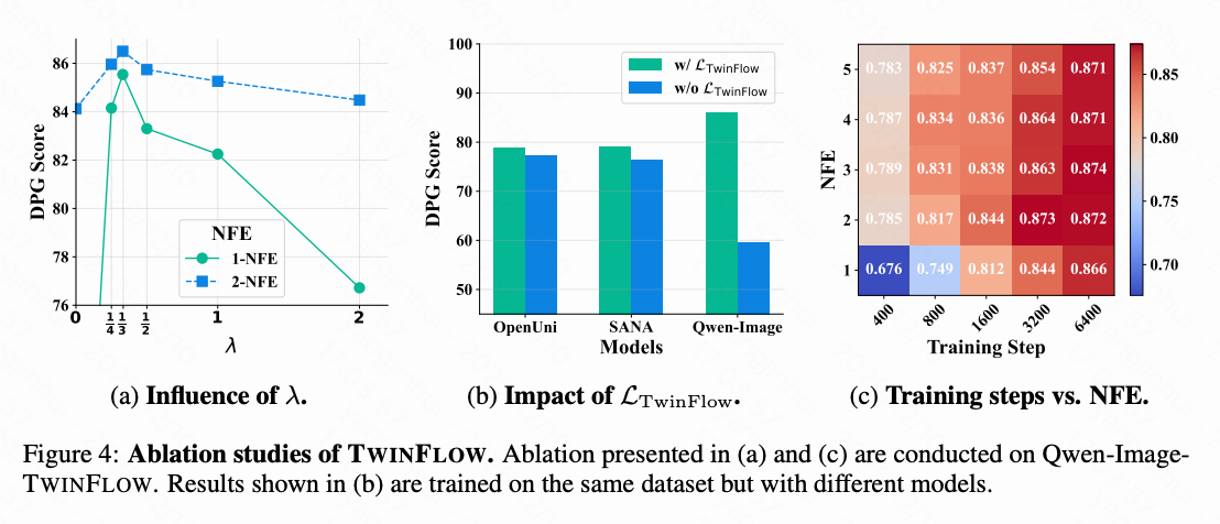 对不同模型的影响。 本文进行了一项消融研究,以分析在不同模型上使用 对文本到图像性能的影响。如上图 4b 所示,引入 显著提高了性能:它改善了 OpenUni、SANA,尤其是 Qwen-Image(从 59.50 到 86.52)在文本到图像任务上的 1-NFE 性能。