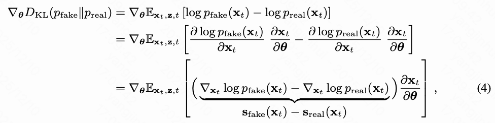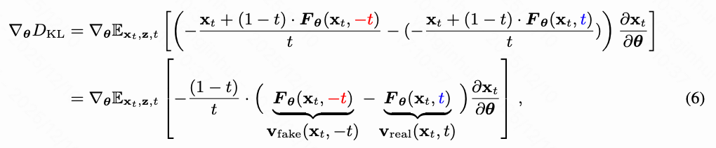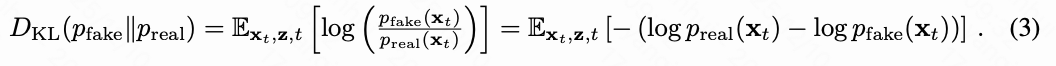理想情况下,本文希望双轨迹相互匹配。如前文所述,分布 和 分别对应由负时间和正时间间隔参数化的轨迹。受 DMD的启发,本文可以将其视为一个分布匹配问题。对于任何扰动样本 ,本文旨在最小化这两个分布之间的 KL 散度: