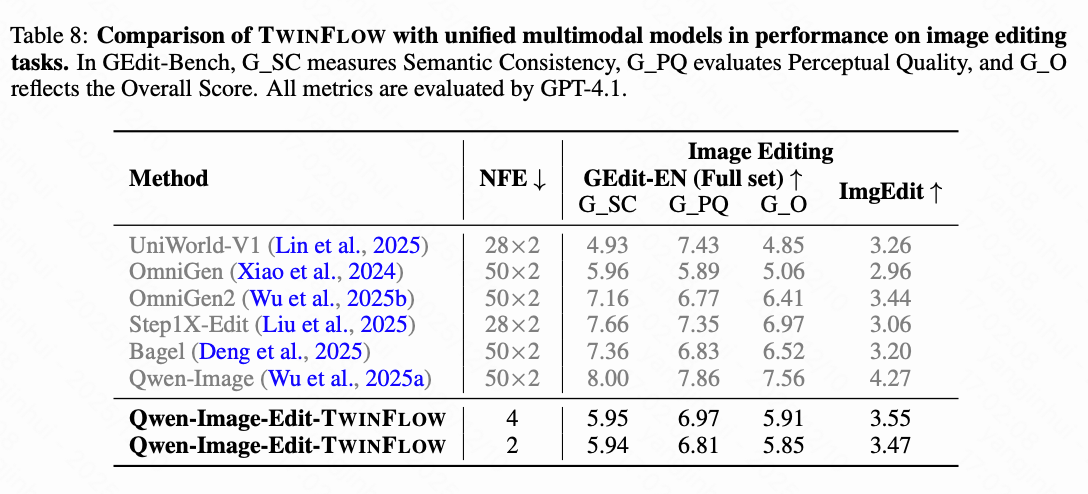 图像编辑的探索。 由于资源限制,本文对 TWINFLOW 在图像编辑方面的能力进行了初步探索,使用了大约 15K 编辑对的小型微调数据集。尽管规模有限,本文的结果(参见下表 8)表明 TWINFLOW 可以将 Qwen-Image-Edit转换为一个 4-NFE 编辑模型。这表明,如果能够访问更多样化的编辑数据集,本文预计在编辑输出的保真度和多功能性方面都会有实质性的进一步改进。