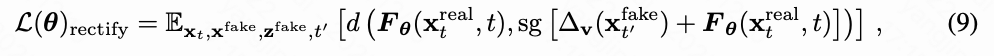 其中 是一个度量函数。最小化此损失教会网络学习负时间条件和从噪声到假数据分布的变换,为下一节中描述的校正损失奠定了基础。
