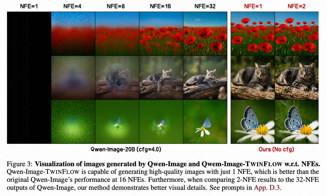 如下图 3 所示,是 Qwen-Image 和 Qwem-Image-TWINFLOW 在不同 NFE 下生成的图像的可视化结果。Qwen-Image-TWINFLOW 能够以 1 NFE 生成高质量图像,其性能优于原始 Qwen-Image 在 16 NFE 下的表现。此外,将 2 NFE 的结果与 Qwen-Image 的 32 NFE 输出进行比较时,本文方法在视觉细节方面表现出更好的效果。
