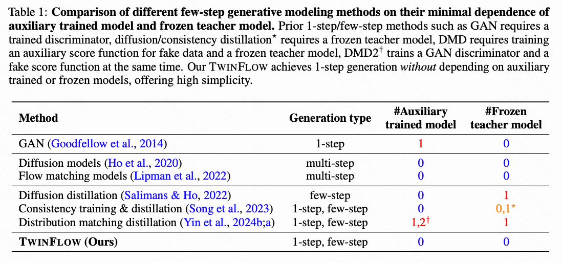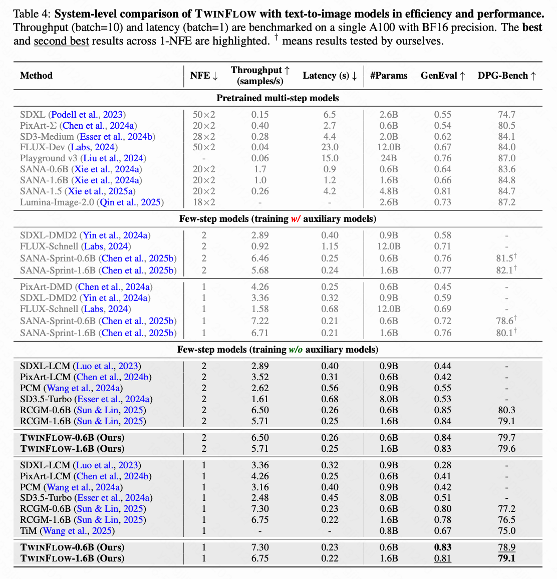 TWINFLOW,一个用于训练大型少步连续生成模型的简单而有效的框架。消除了对 GAN 判别器或冻结教师模型等辅助训练组件的需求。允许对大模型进行直接的 1 步或少步训练,使其特别易于访问和高效。通过在不同规模和任务上进行的大量实验,证明了 TWINFLOW 在大模型上的文本到图像合成中提供了高质量的生成能力。