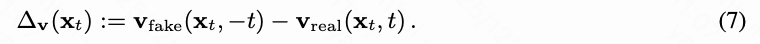 校正损失推导。 为了推导校正损失,本文首先使用第 3.1 节中的设置实例化梯度 (6)。在此设置中,网络的预测 作为干净的示例,因此,(6) 中的扰动变量 对应于假样本 。因此,(7) 中定义的速度差 被实例化为 。