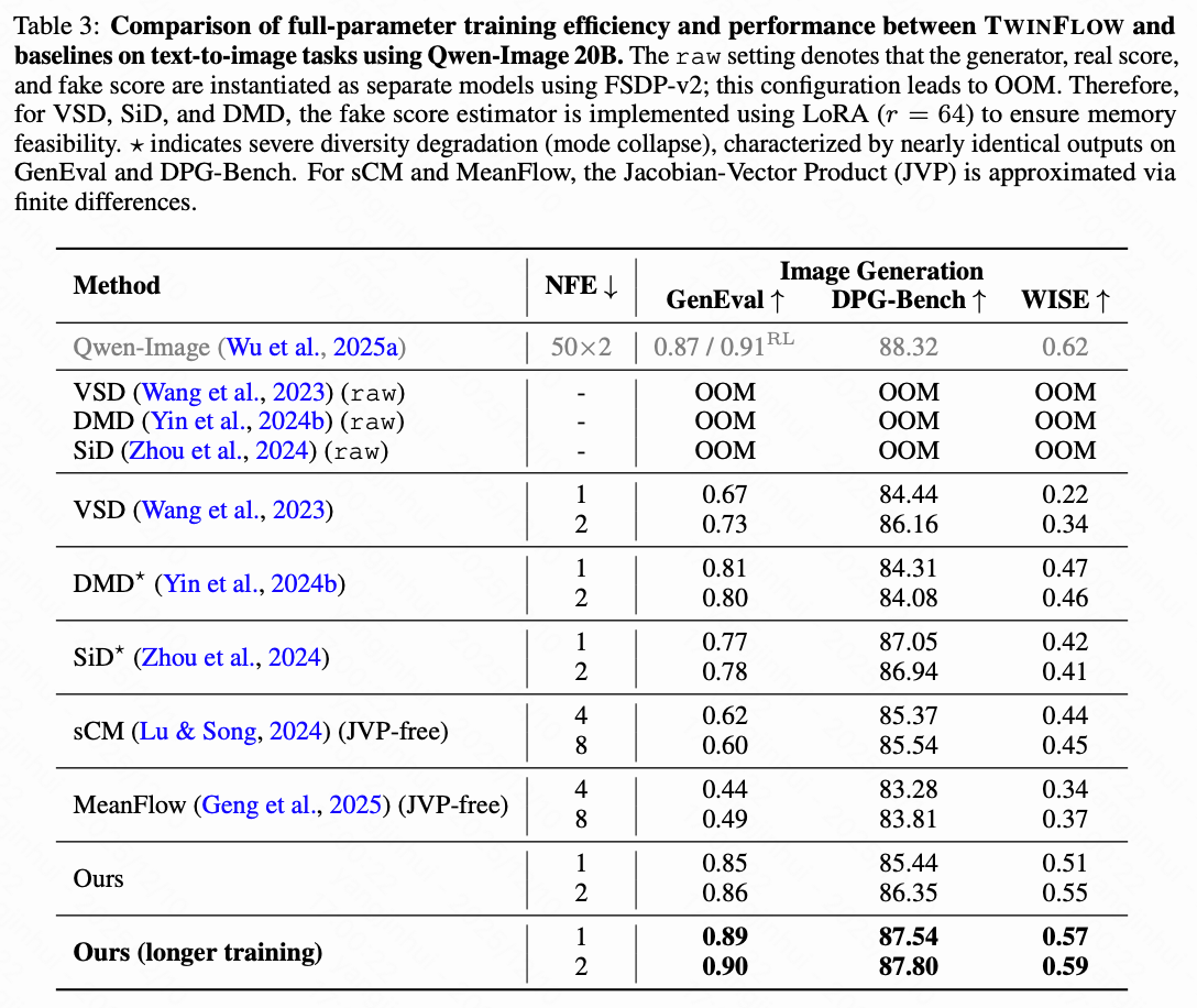 对 Qwen-Image 进行 20B 全参数训练的进一步探索。 上表 3 展示了 TWINFLOW 在大规模 Qwen-Image-20B 上进行全参数训练的扩展性和性能优势。现有的分布匹配方法,如 VSD、DMD 和 SiD,通常需要维护三个独立的模型副本(生成器、真实分数和假分数),导致显著的内存开销。相比之下,TWINFLOW 通过统一设计脱颖而出: (a) 简单性和效率: 通过将生成器、真实/假分数估计集成到一个模型中,TWINFLOW 消除了对冗余参数的需求。这允许在 20B 规模下进行全参数训练。 (b) 性能优越性: 凭借这种统一设计,TWINFLOW 在 Qwen-Image-20B 上超越了所有基线。值得注意的是,与 8 NFE 下运行的 sCM和 MeanFlow相比,它仅用 1-2 NFE 就实现了卓越的生成质量。
