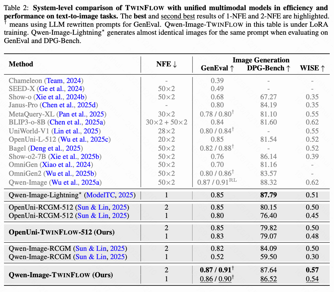 本文方法比最先进的统一多模态生成模型具有两个关键优势: (a) TWINFLOW 在 Qwen-Image-20B 上以 1-NFE 保持 >0.86 的 GenEval 分数:超越了大多数多步模型(40-100 NFEs),例如 Bagel、MetaQuery。 (b) TWINFLOW 在没有任何辅助组件或架构修改的情况下实现了这一点,这与需要蒸馏或专门训练管道的竞争性少步方法不同。