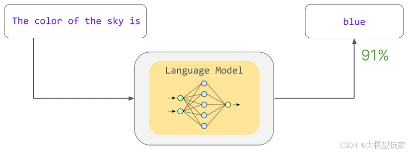 语言模型可以根据其在训练过程中学习到的统计模式,预测最可能跟随某个短语的单词(或多个单词)。在图中,语言模型可能会估计“天空的颜色是”这个短语后面跟着“蓝色”一词的概率为91%。