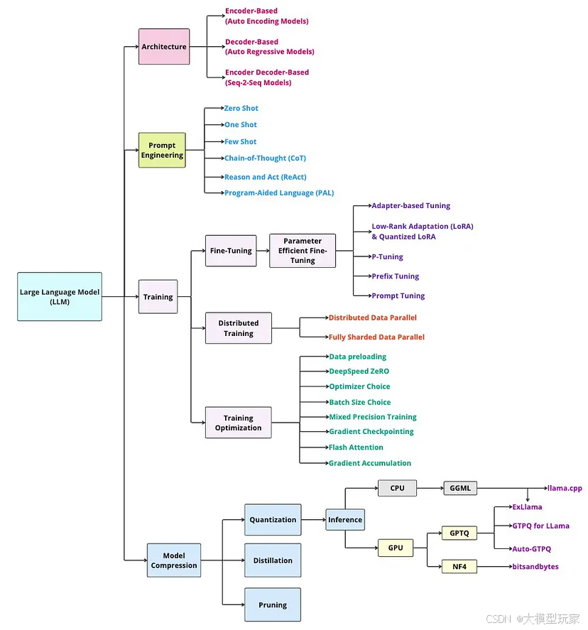 本文全面梳理了大模型的各方面知识点,包括参数微调(PEFT)技术,适配器、LoRA和QLoRA,同时介绍了提示策略、模型压缩方法(如剪枝和量化),以及各种量化技术(GPTQ、NF4、GGML)。最后,对用于减小模型大小的蒸馏和剪枝技术也进行了讲解,希望对大家有帮助!