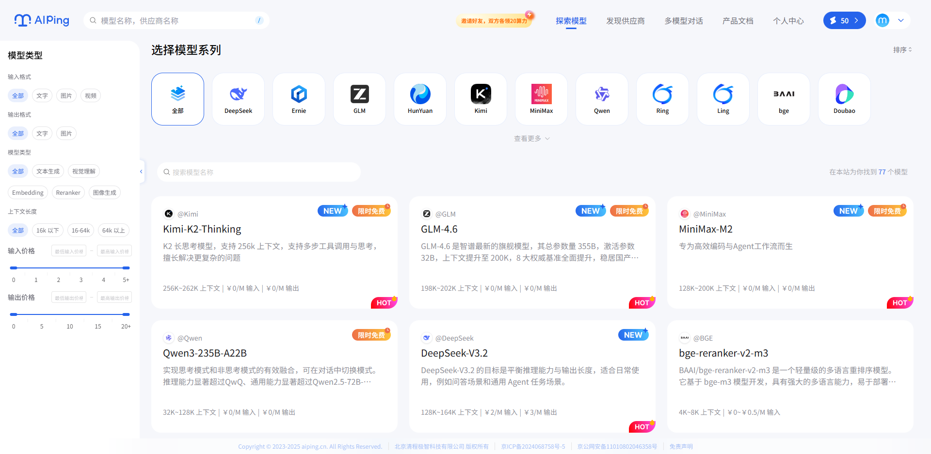 除此之外,AI Ping 还提供详尽的模型详情页,系统化展示每个模型的核心参数,包括最大上下文长度、输出限制、定价策略、支持的语言等,支持横向对比与深度查询,极大提升了模型选型与技术评估的效率。