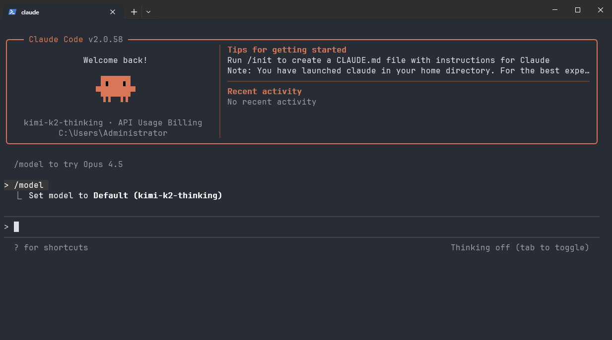 - 启动后,选择 “信任此文件夹 (Trust This Folder)”,以允许 Claude Code 访问该文件夹中的文件,随后开始在 Claude Code 中使用 Kimi-K2-Thinking。
