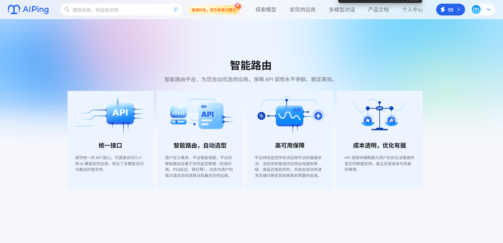 针对“每换一个模型就要重写一套对接代码”的痛点,AI Ping 提供统一 API 接口,开发者只需一次集成,即可无缝访问平台上所有已接入的模型服务,彻底告别多平台切换与重复开发。更进一步,平台还推出API 智能路由功能:开发者调用大模型服务时,希望“省时省力地获得兼顾速度与成本的选择”,该功能可根据用户的意向模型,帮助用户在众多大模型API服务平中智能选择最优供应商:用户只需明确自身业务需求(如响应速度优先级、成本控制目标等),平台便会开启智能调度模式——基于实时监控的多维度数据(包括各供应商的服务价格、P90 延迟、吞吐能力等),结合负载均衡与成本优化算法,为每一次请求动态匹配当前最优供应商。其中,业务高峰期优先选择吞吐能力强、延迟低的供应商,保障服务流畅不卡顿;非高峰时段自动切换至性价比更高的选项,帮助开发者节省成本与时间。