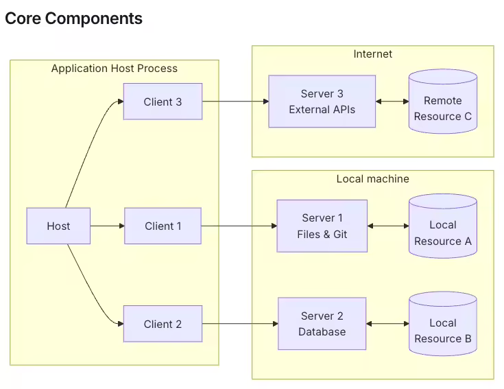 这一定义明确地将Host引入,构成了理解MCP的关键。将一个三组件(Client-Host-Server, CHS)系统误读为两组件(CS)系统,会直接导致对协议职责、数据流向和AI能力归属的严重误判,为后续的系统设计与问题排查埋下隐患。