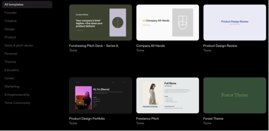 Tome专注于"故事化演示",通过AI将文字描述转化为图文并茂的叙事型PPT,将PPT演示与故事叙述融合,支持互动组件与AI写作助手。