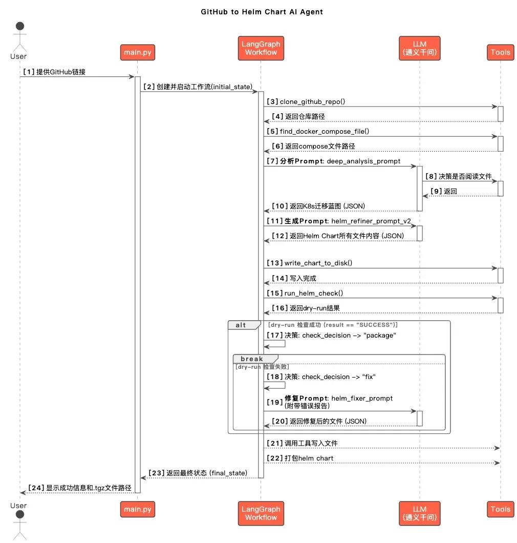 在那个瞬间,我脑海里闪过的一个宏大的图景——一个全能的应用部署agent,好吧冷静下来,还是聚焦于一个小的开始,k8s部署物的自动生成。(输入一个开源项目(如 GitHub 链接),AI Agent 能够分析项目,并输出一个可直接部署的 Helm Chart 包。)