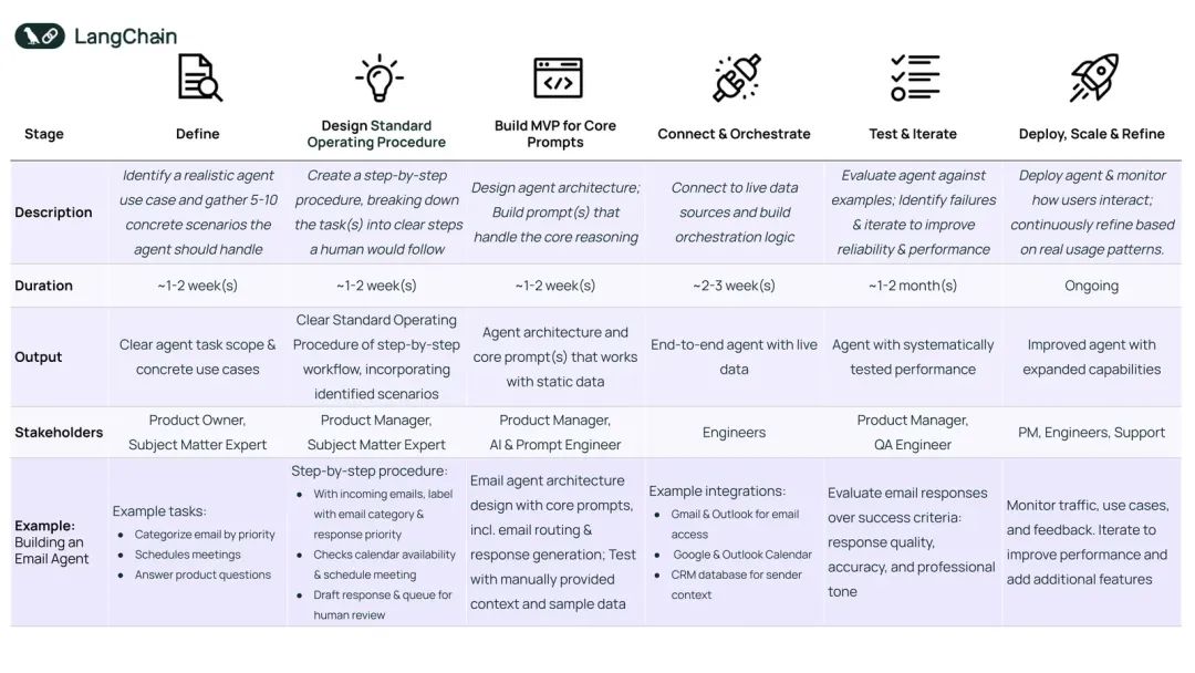 LangChain给了一个宏观指导,它把构建 Agent 的过程分成了几个阶段,从定义到部署。