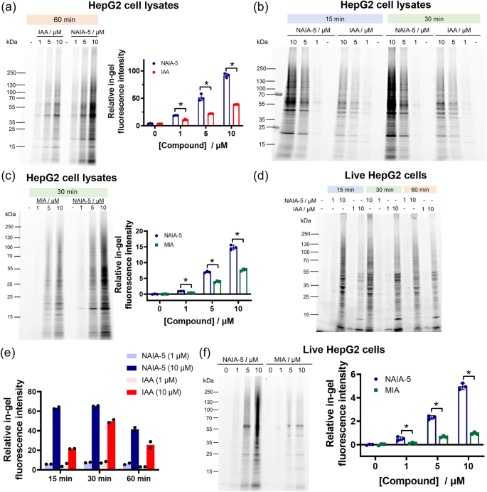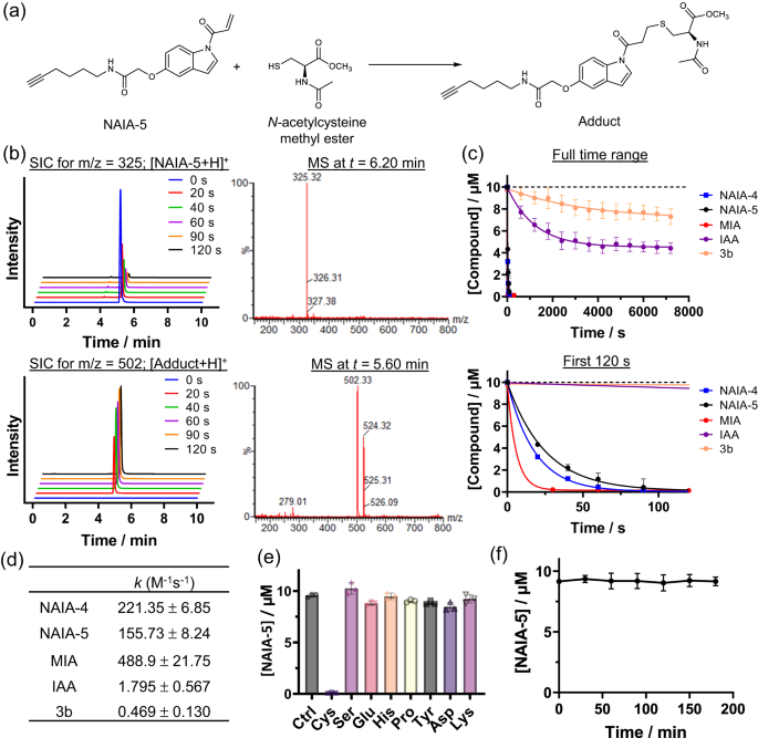 反应更快、更彻底:在试管实验中,NAIA能在几分钟内完全与半胱氨酸反应,而IAA则慢得多且反应不完全。
