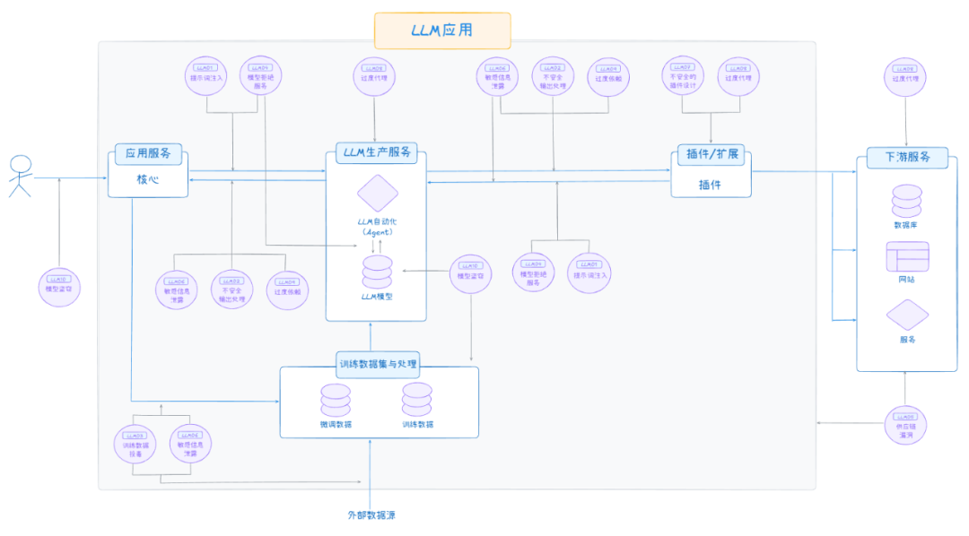 在 OWASP 的架构图中,紫色圆圈标记(LLM01-LLM10)揭示了 LLM 应用在不同生命周期阶段面临的关键安全威胁。我们将这些漏洞按照其在架构中的分布层面进行分类阐述。