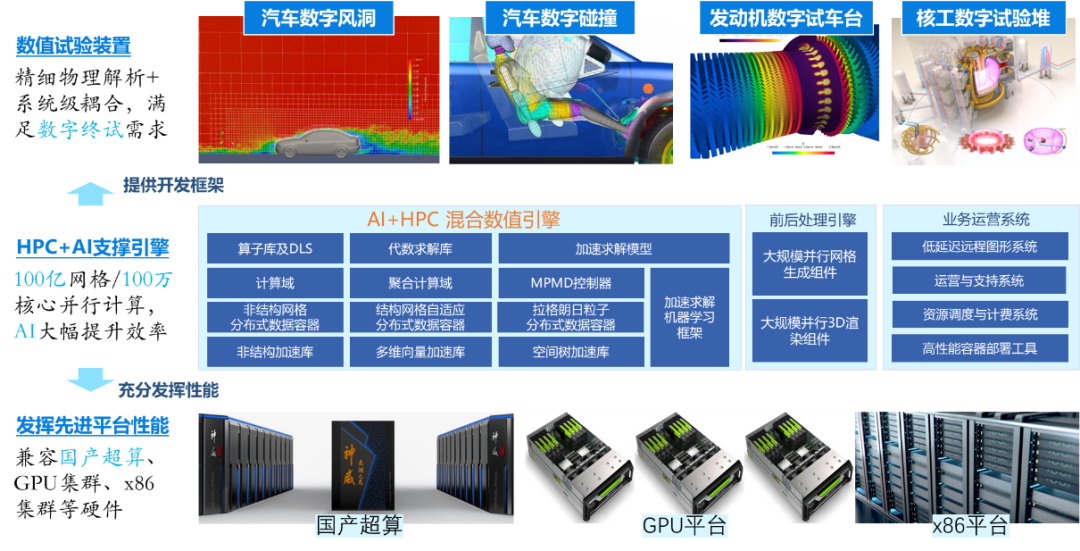 “数字孪生试验”以“超算+AI”为基础支撑,以超高保真度数值模拟、智能求解加速、实测数据融合与智能修模为主要手段,力求破解“精度和效率难兼顾”、“模拟和试验难对齐”等核心难题。“数字孪生试验”将引领行业最高保真度,主要面向高端装备设计研发的“数字终试”需求,大幅加速试验合格迭代过程。