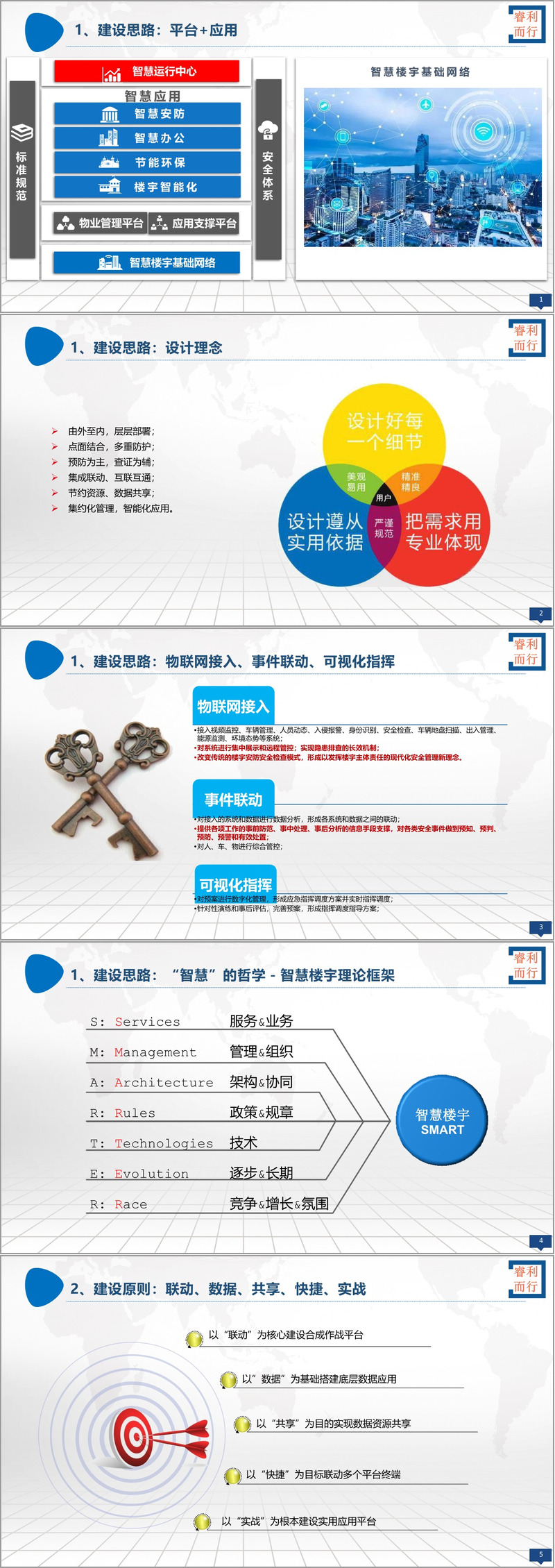 方案遵循 “平台 + 应用” 的建设思路,以 “联动、数据、共享、快捷、实战” 为核心原则,构建了 “感知 / 设备 — 网络 — 应用平台 — 呈现与管理” 的整体架构。设计理念上坚持由外至内层层部署、点面结合多重防护、预防为主查证为辅、集成联动互联互通等原则,形成了涵盖服务与业务、管理与组织、架构与协同等多维度的智慧楼宇理论框架,确保方案的全面性与前瞻性。