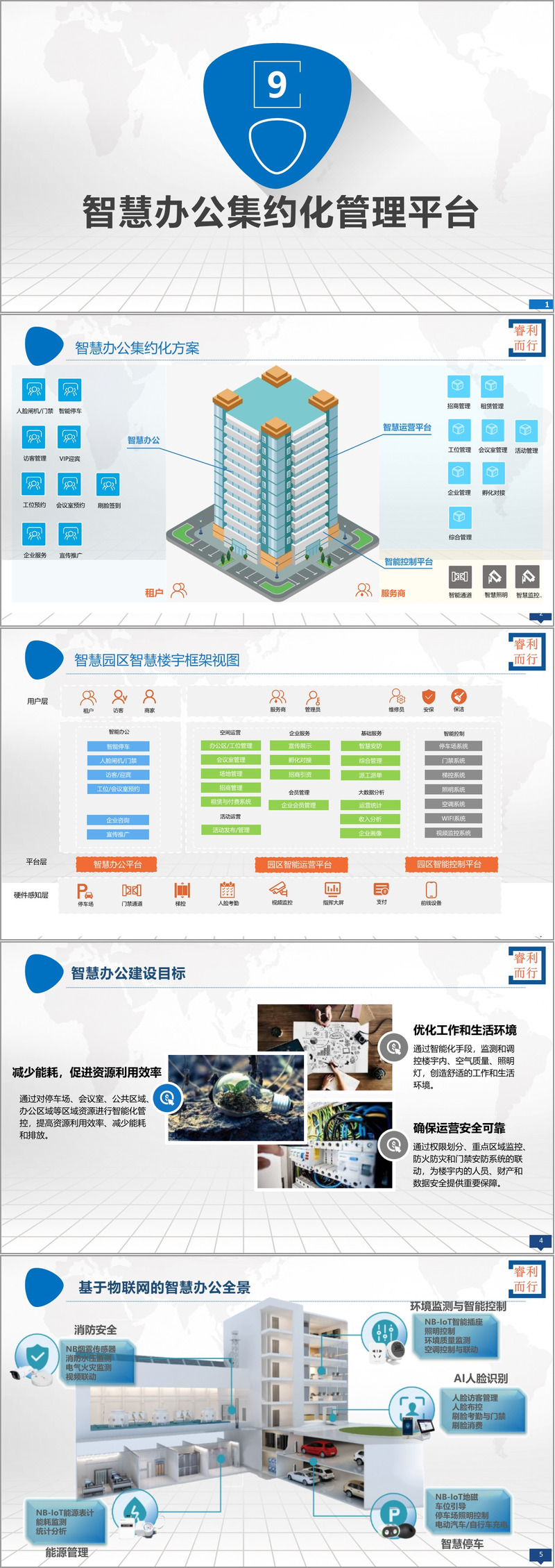 作为聚焦智慧园区、楼宇与办公场景的集约化解决方案,本方案以 “睿利而行” 为核心理念,依托物联网、大数据、AI 人工智能、5G 等前沿技术,破解传统楼宇系统 “信息孤岛”“应用烟囱” 等痛点,构建了覆盖能源管理、环境监测、智能控制、AI 人脸识别、智慧停车、消防安全等多场景的一体化智能平台,旨在实现园区与楼宇的便捷管理、安全保障、节能环保与智能办公目标。