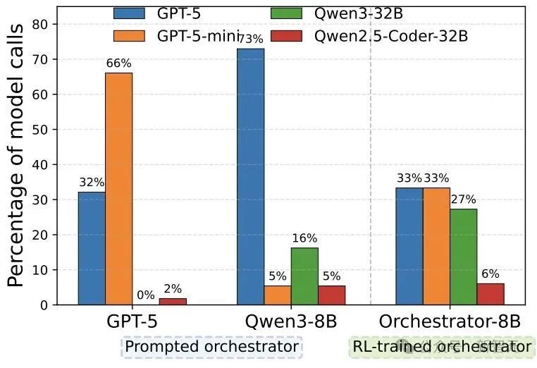 其中用于调度的8B小模型Orchestrator,会通过强化学习,根据用户声明的倾向,系统自动倾向本地部署模型。