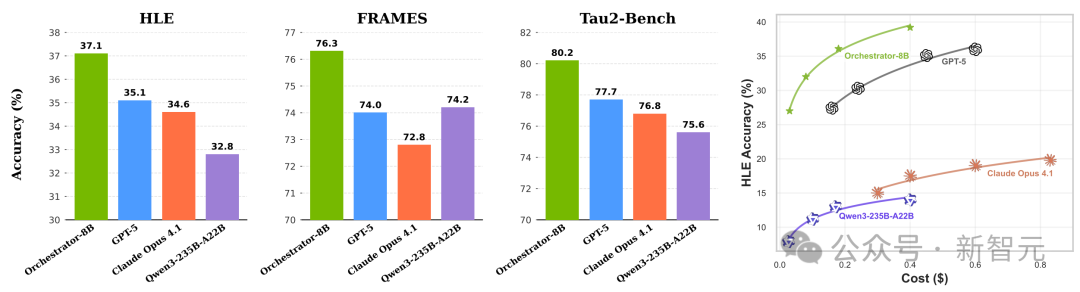 在HLE基准测试中,Orchestrator斩获了37.1%的高分,一举超越了GPT-5(35.1%),同时在效率上提升了2.5倍。